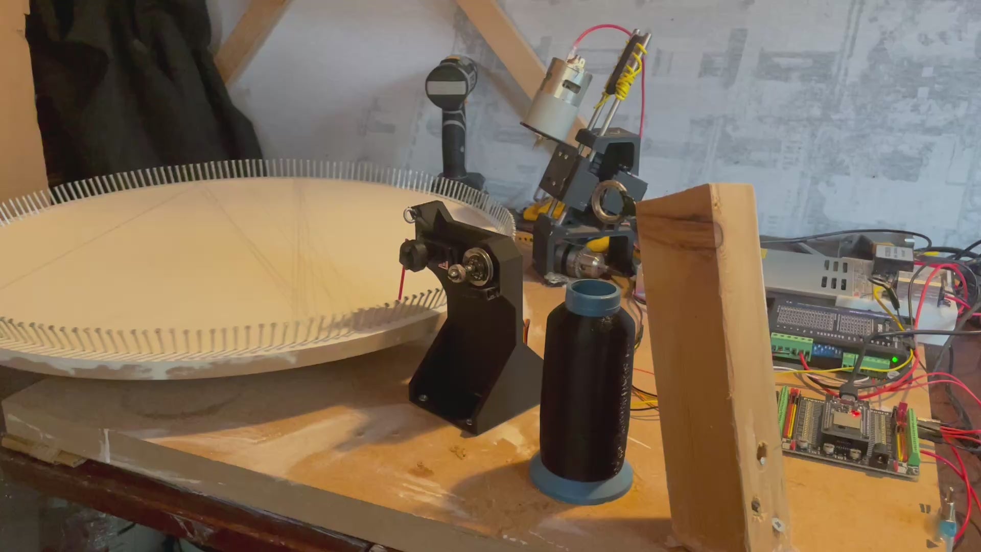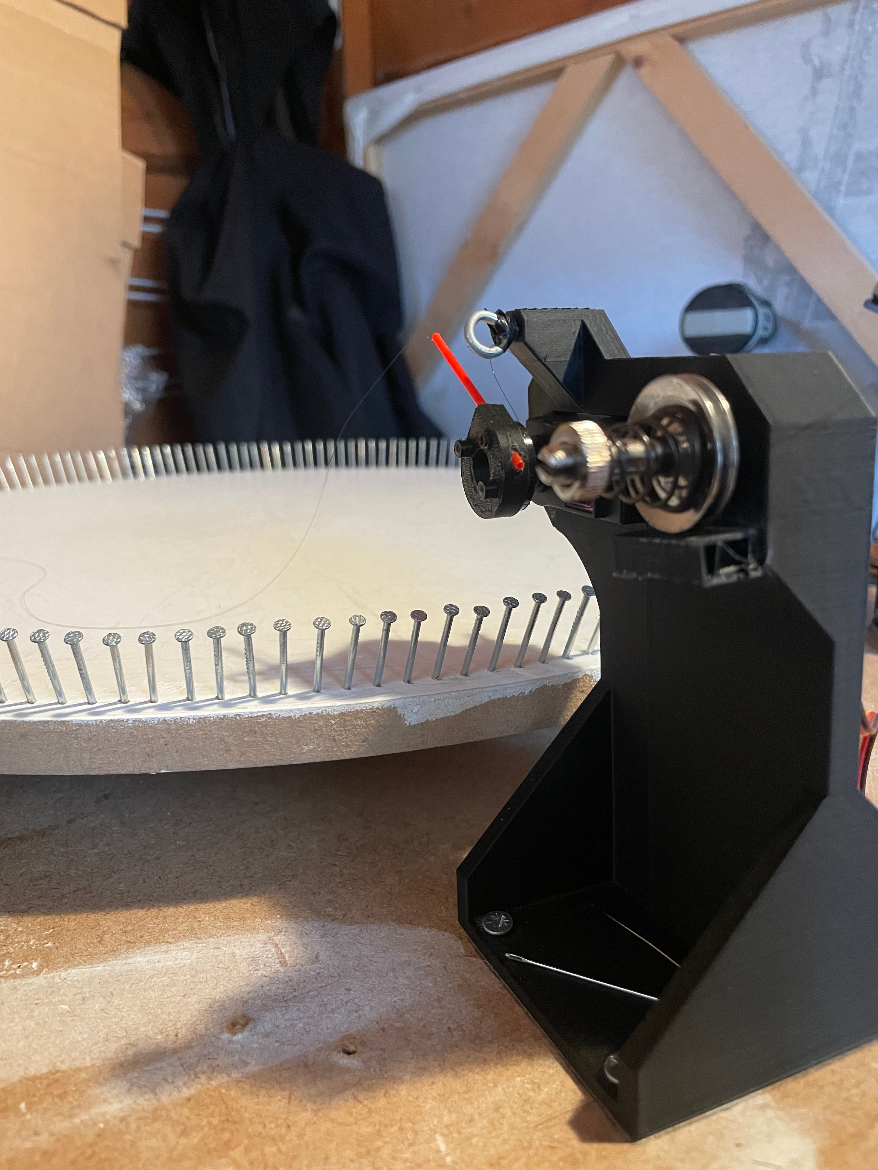 - Thread hooking mechanism. Thread is fed through a tensioner and guided down a small flexible tube which flicks between the nails. This tube can bend around nails without breaking, reducing the need for precise setup and alignment. A servo motor controls the motion of the tube.