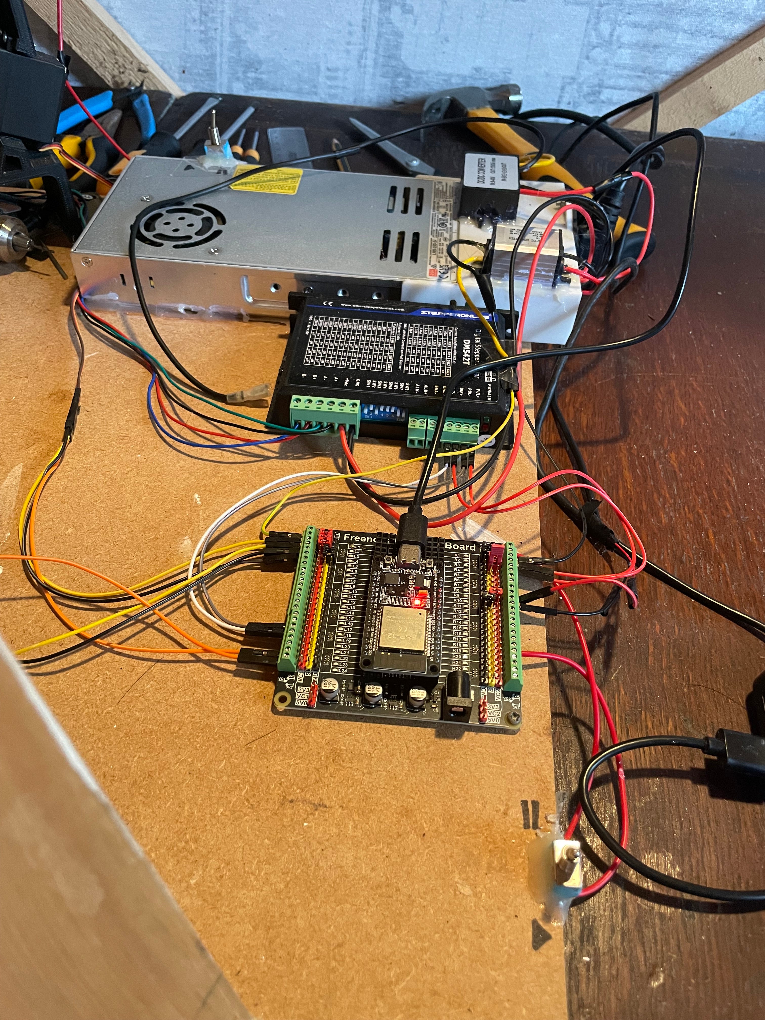 Electronics include: microcontroller, stepper driver, DC-DC converters, high spec power supply (with switch), software enabled pause switch