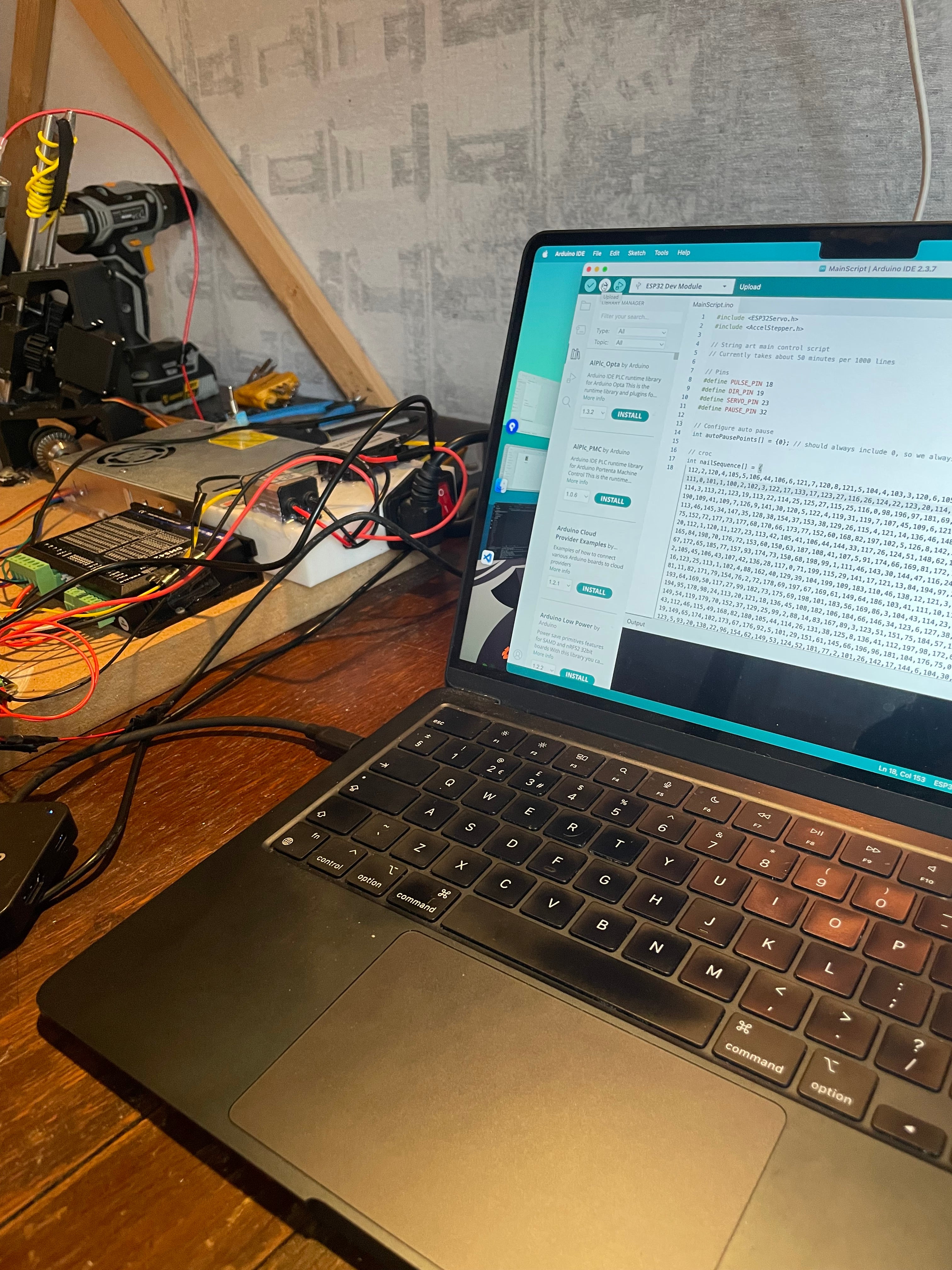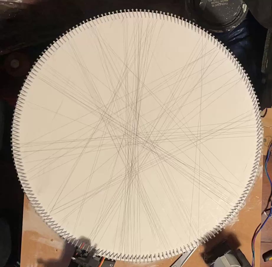 I have built a reliable and accessible machine to automate the stringing process for string art. The machine is built with off the shelf electronic components and 3D printed parts. During stringing, the machine runs for about 3.5hrs and can be configured to pause midway to restock thread. It is incredibly low maintenance and runs with optimised controller code to ensure reliability over hundreds of thousands of stringing cycles.